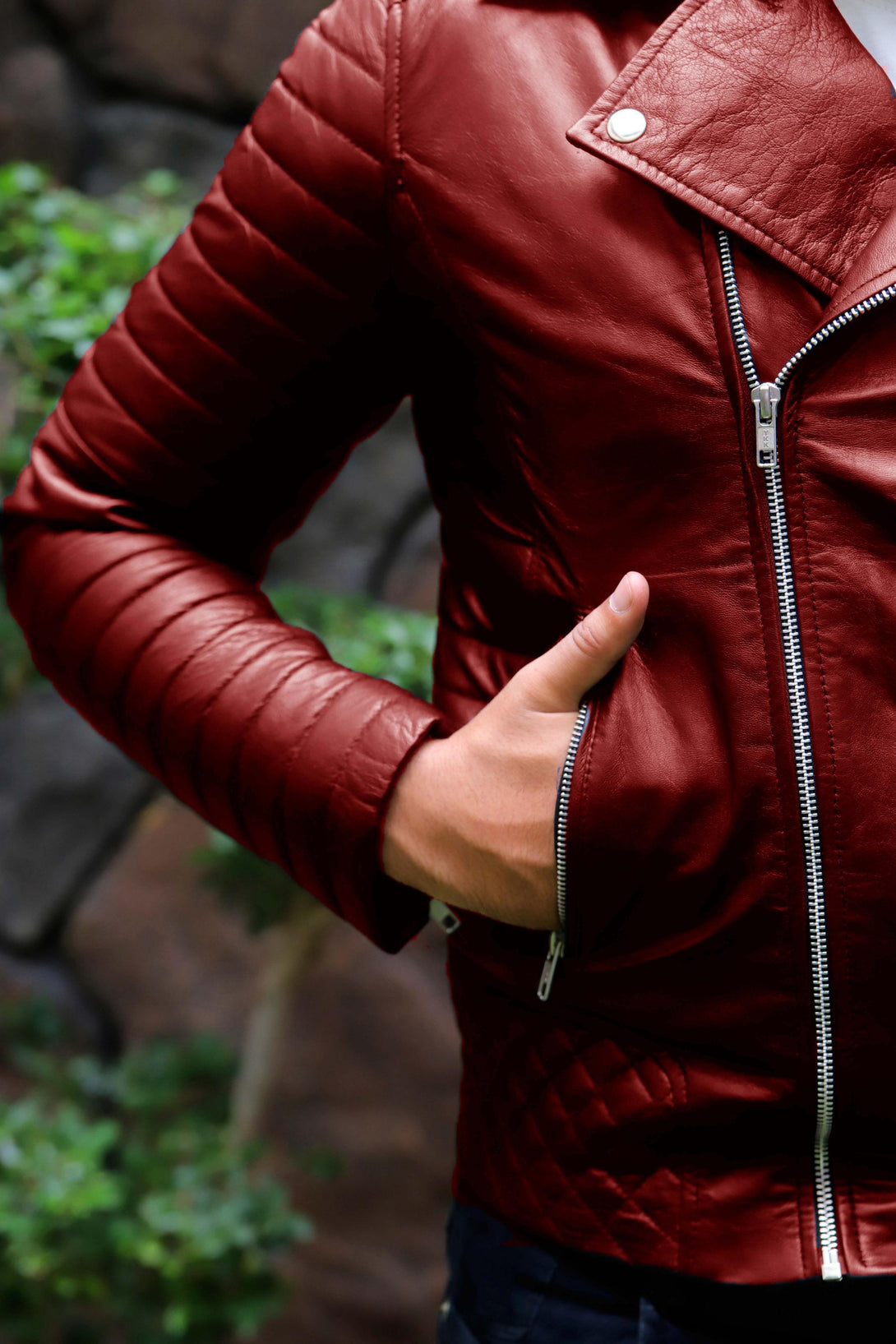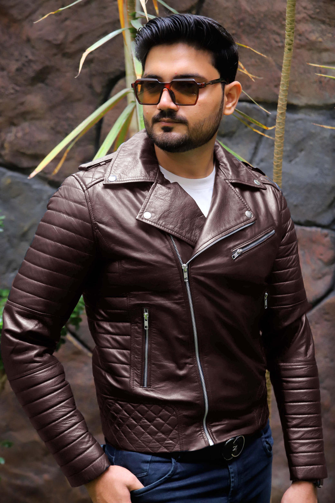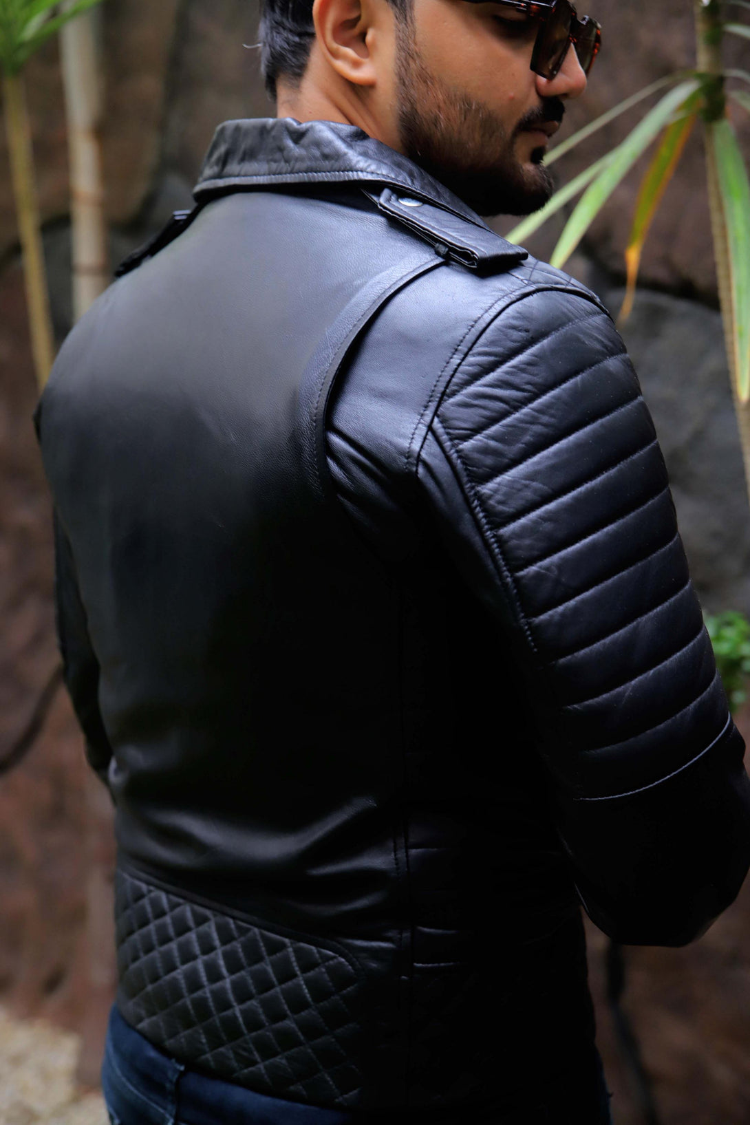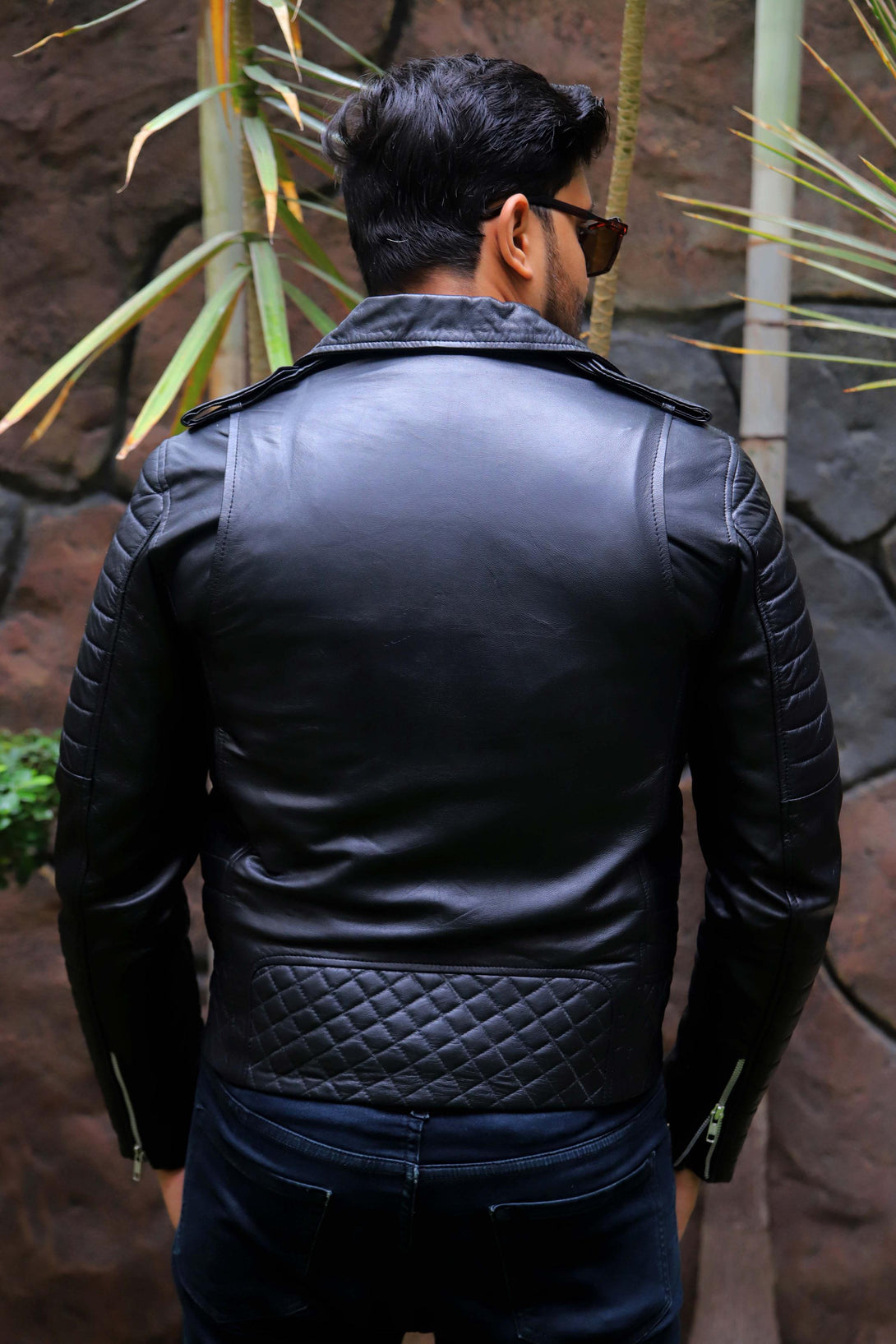 The jacket features the signature asymmetric front zip closure and wide, notched lapels with snap buttons. Extra style and texture come from the quilted horizontal padding on the shoulders and sleeves, and the diamond-quilted panel across the lower back. Functionality is key with multiple zippered pockets, including a small flap pocket on the front, offering plenty of secure space. The zippers on the cuffs allow for an adjustable fit.