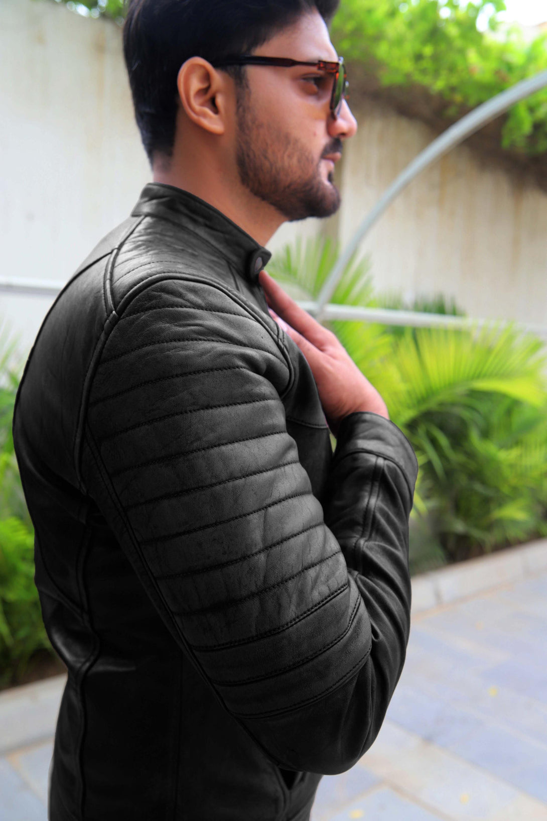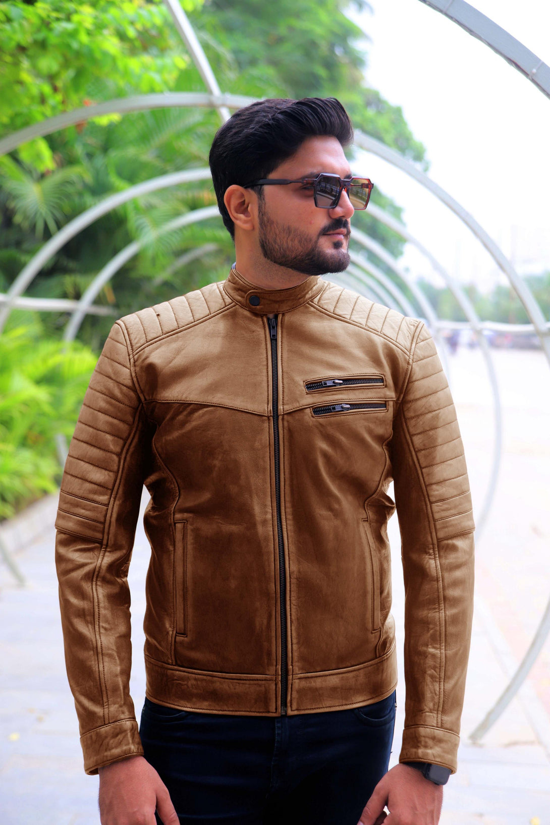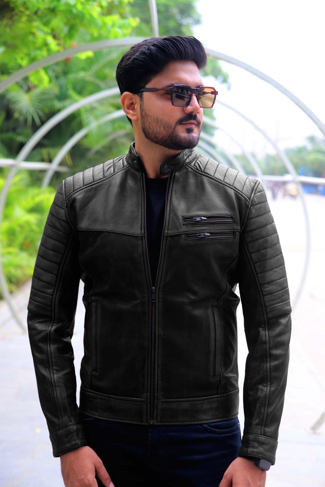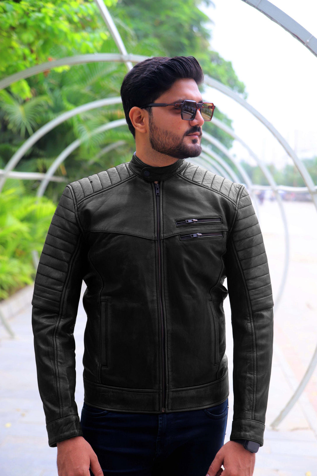 The design is highly detailed, featuring a classic snap-button band collar and a smooth full-front zip. The key style element is the rib-stitched horizontal padding across the shoulders and the outer forearm, adding both texture and a motorcycle-inspired edge. Functionality is provided by two angled zippered chest pockets and two slash side pockets, all secured with high-quality metal hardware.