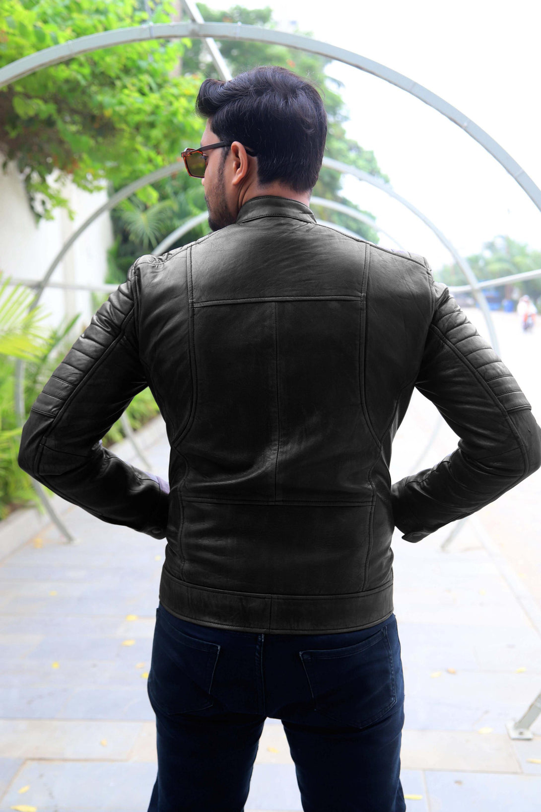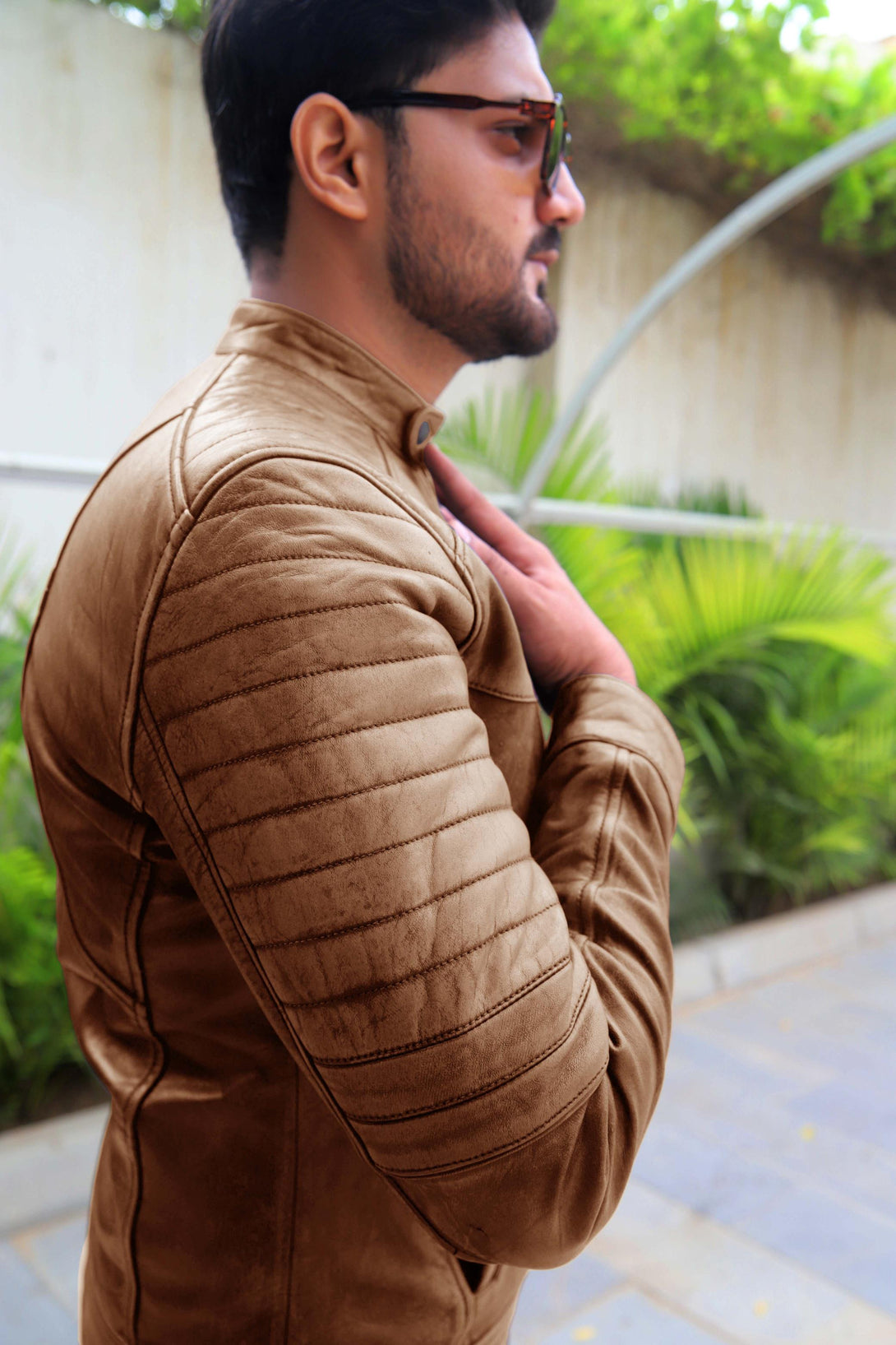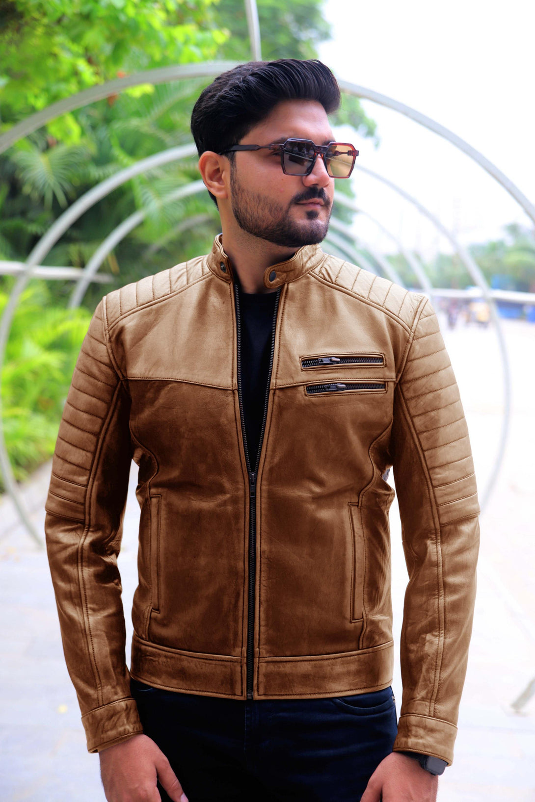 Key Details: Hand-distressed two-tone finish, rib-stitched padded shoulders/sleeves, multiple zippered pockets