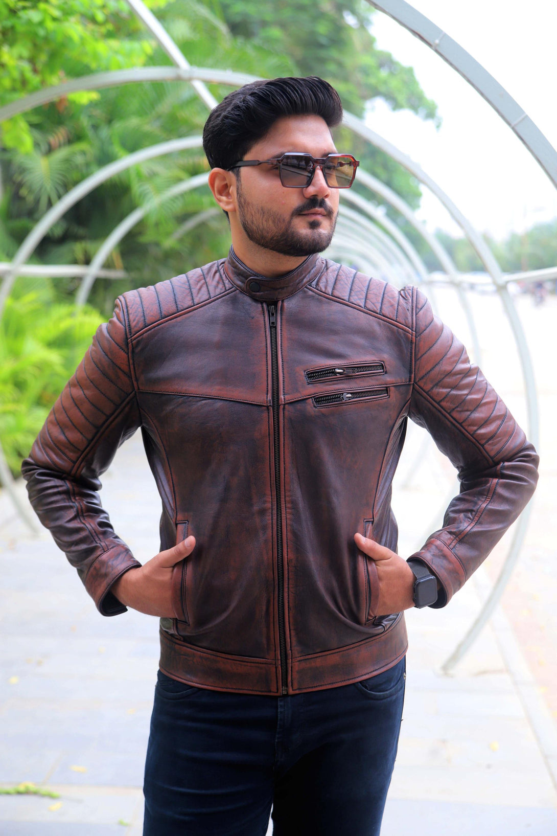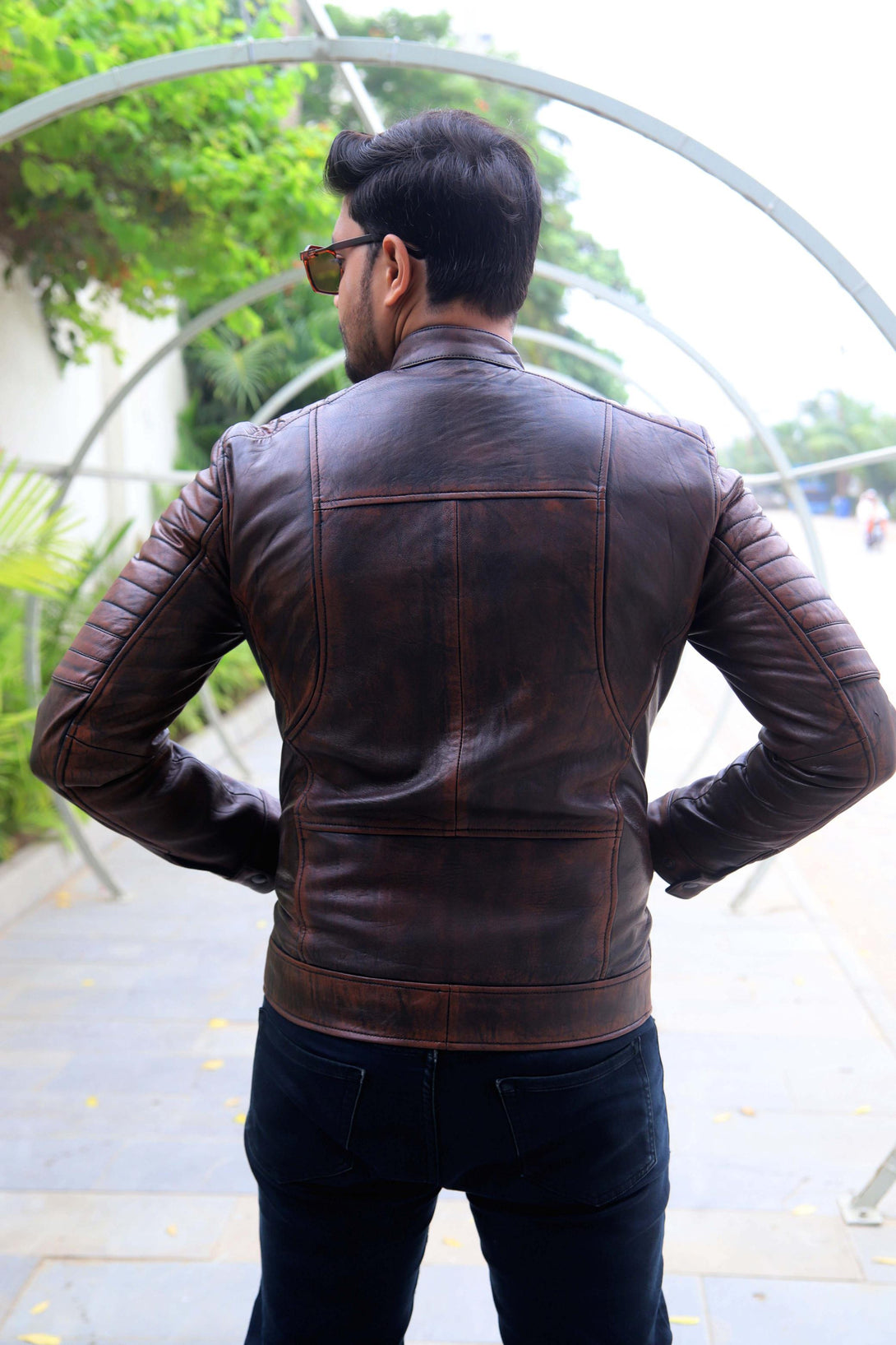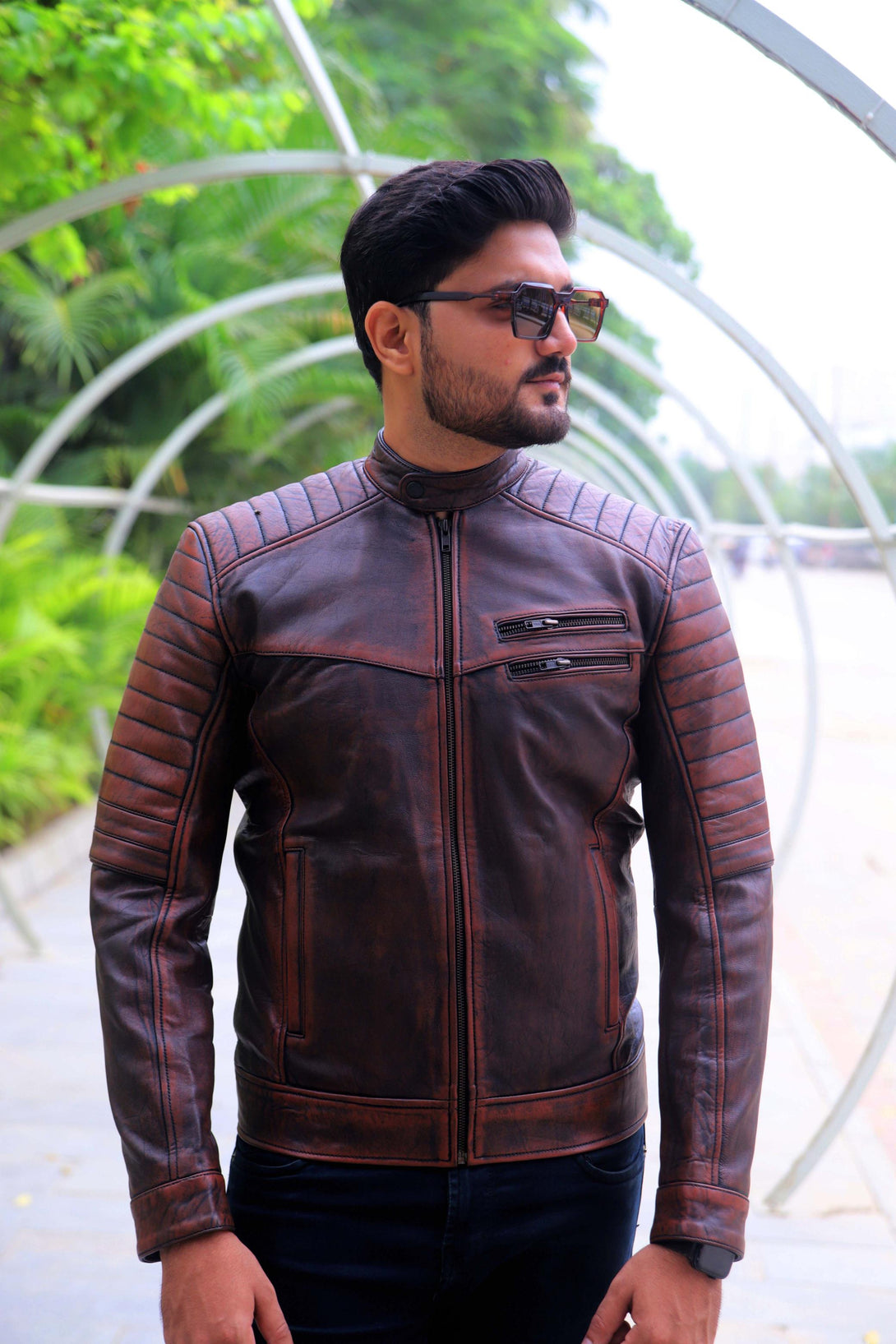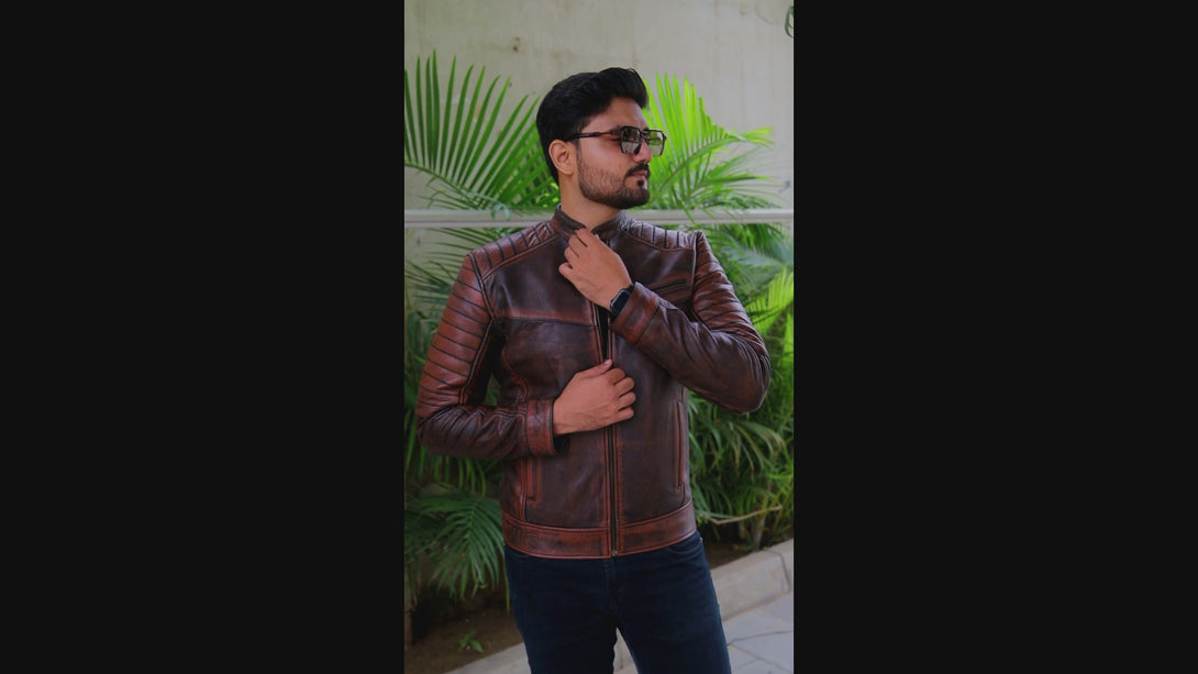 This jacket offers a modern take on the classic cafe racer, elevated by its unique aesthetic. It is crafted from genuine leather with a deep, hand-distressed finish that combines rich brown tones with hints of black. This treatment gives it an authentic, worn-in, and rugged character.