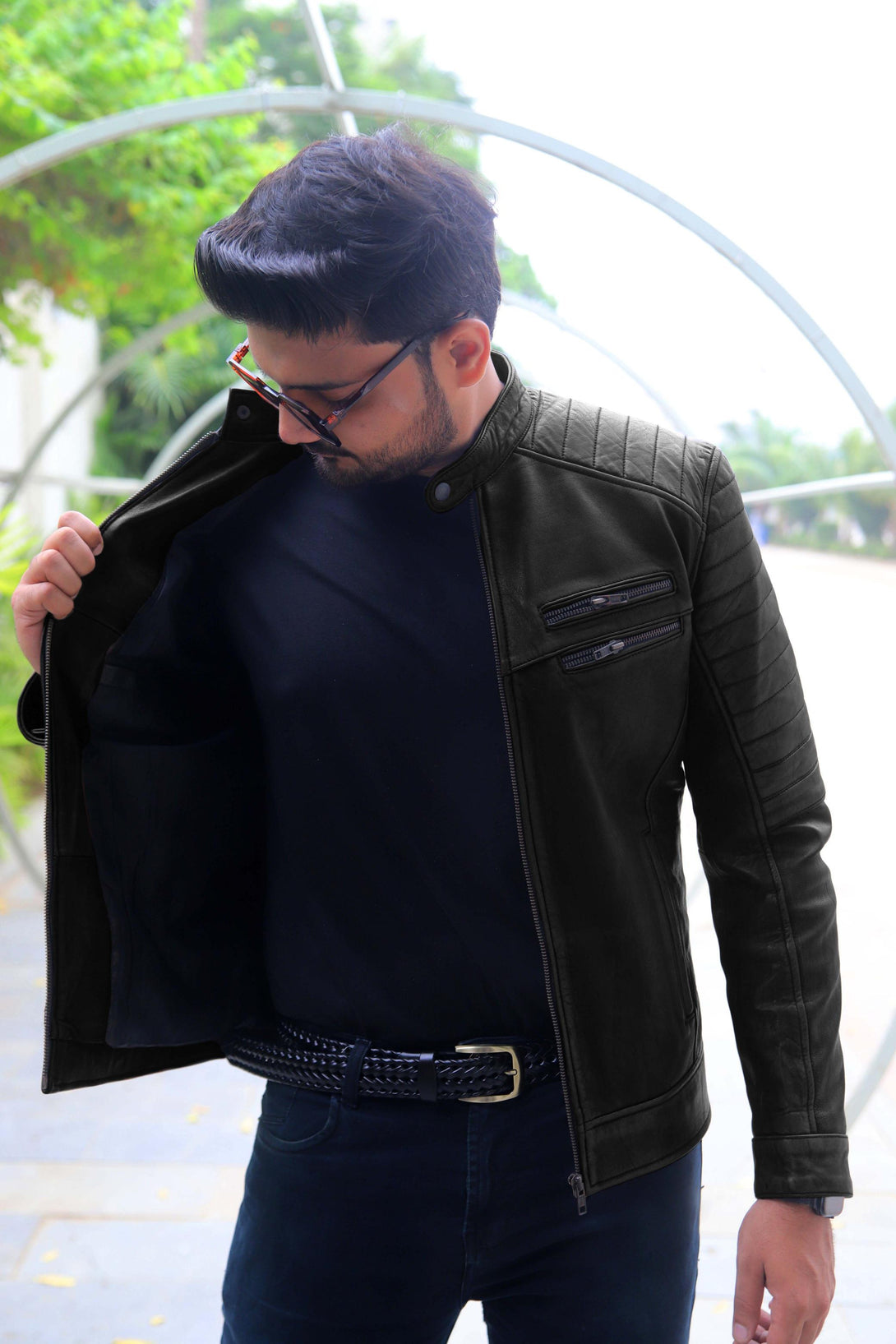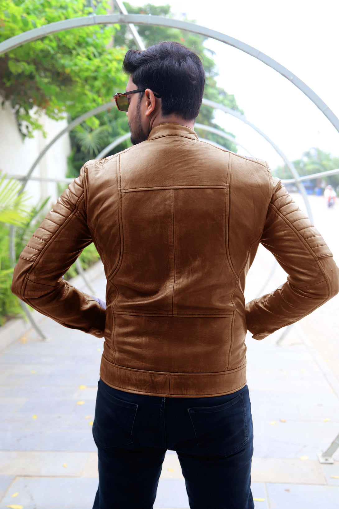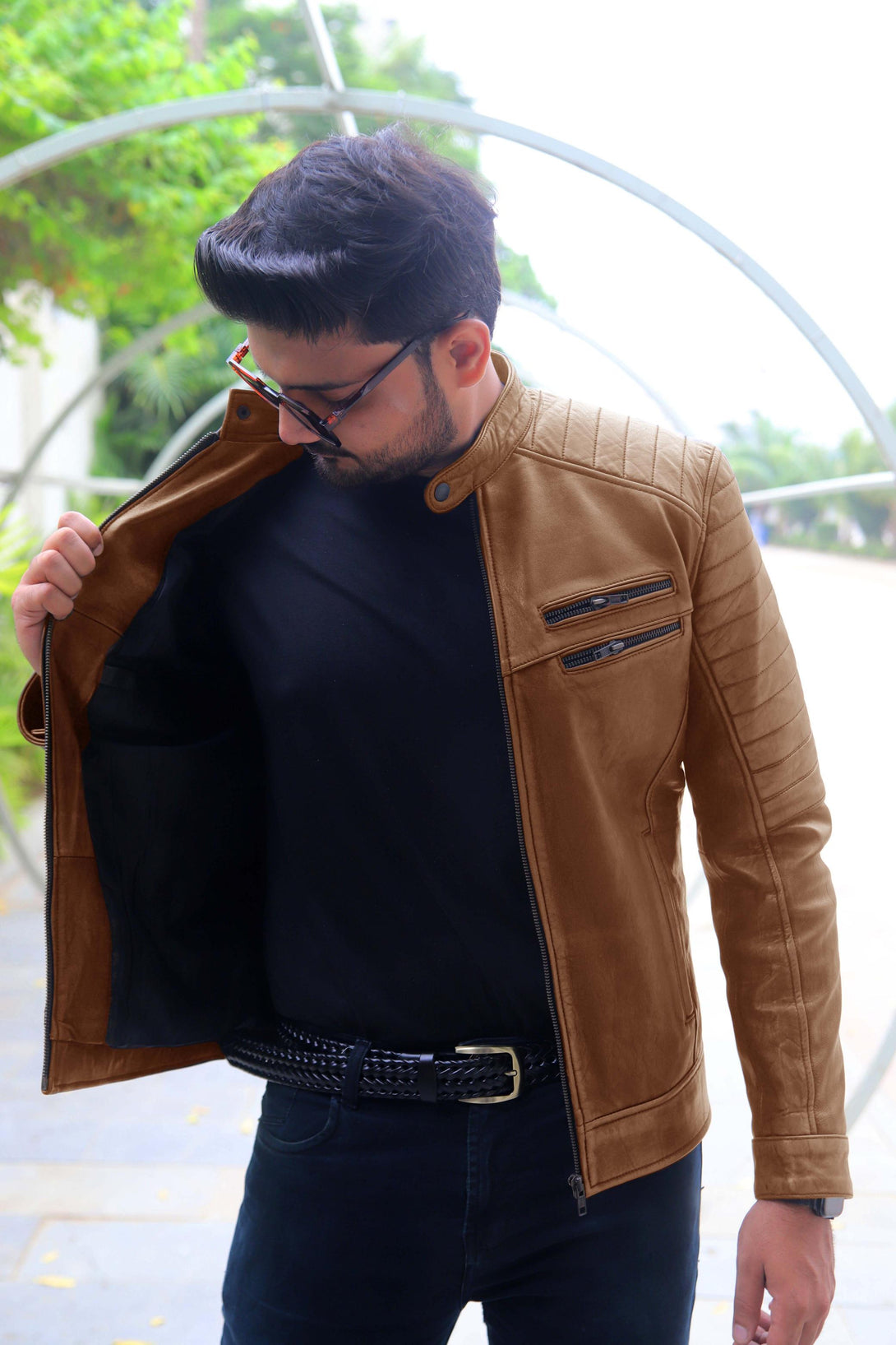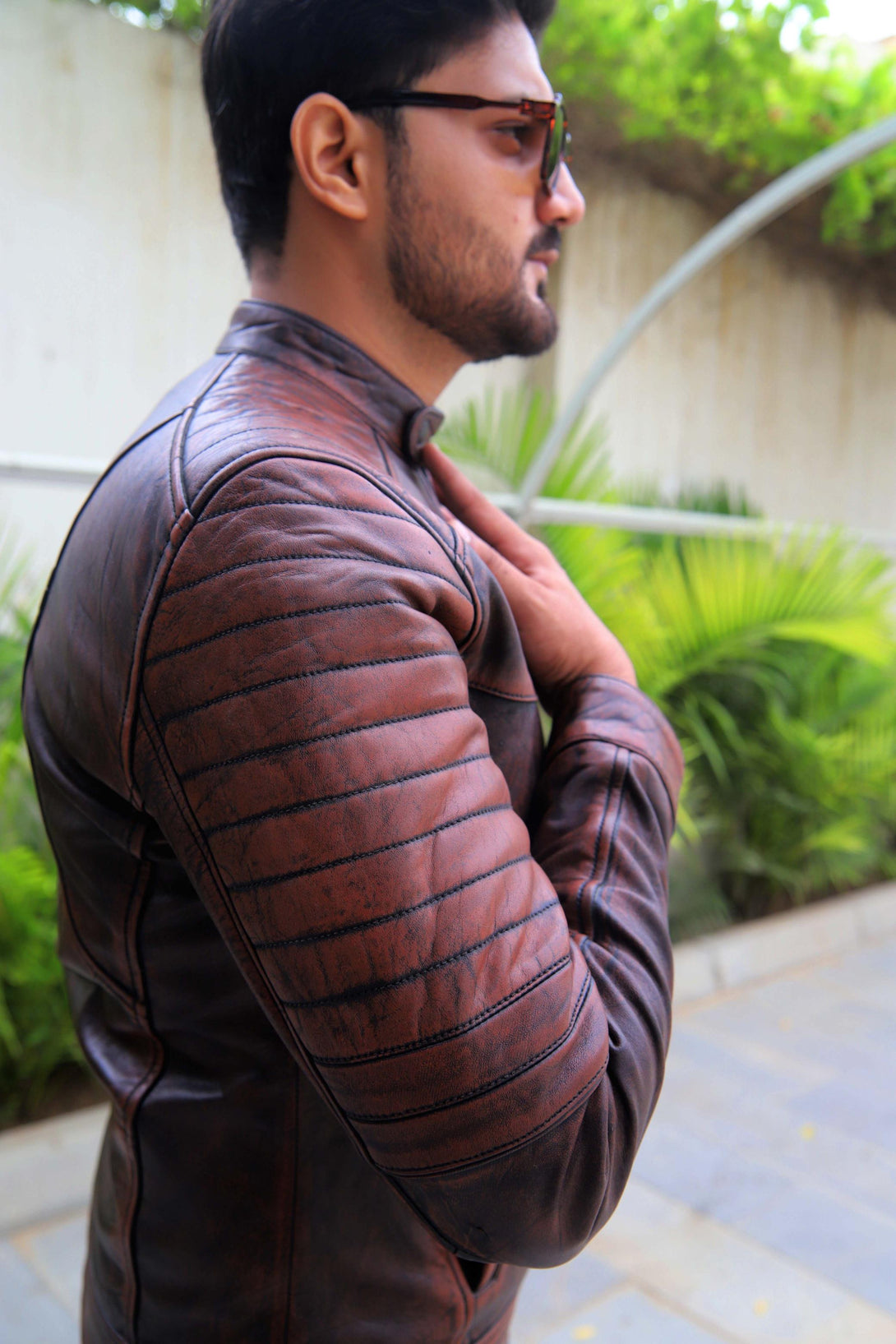 This jacket offers a modern take on the classic cafe racer, elevated by its unique aesthetic. It is crafted from genuine leather with a deep, hand-distressed finish that combines rich brown tones with hints of black. This treatment gives it an authentic, worn-in, and rugged character.