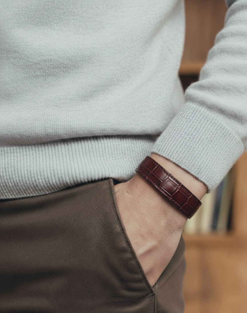 The design is straightforward and adjustable, featuring a simple leather strap that wraps around the wrist, allowing you to customize the fit for maximum comfort. It's a versatile piece perfect for layering with watches or wearing alone to give any casual outfit a strong, confident finishing touch.