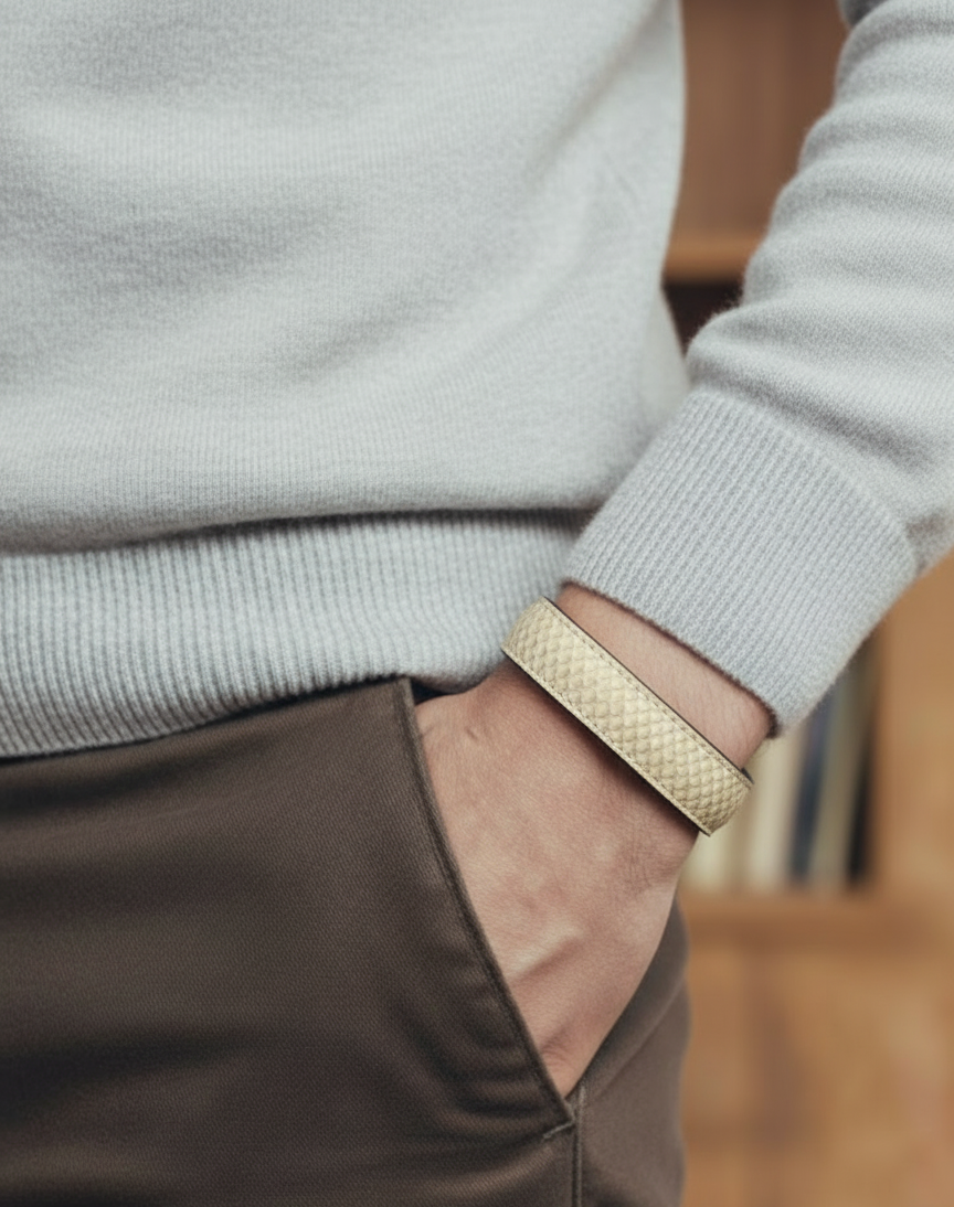 The design is straightforward and adjustable, featuring a simple leather strap that wraps around the wrist, allowing you to customize the fit for maximum comfort. It's a versatile piece perfect for layering with watches or wearing alone to give any casual outfit a strong, confident finishing touch.
